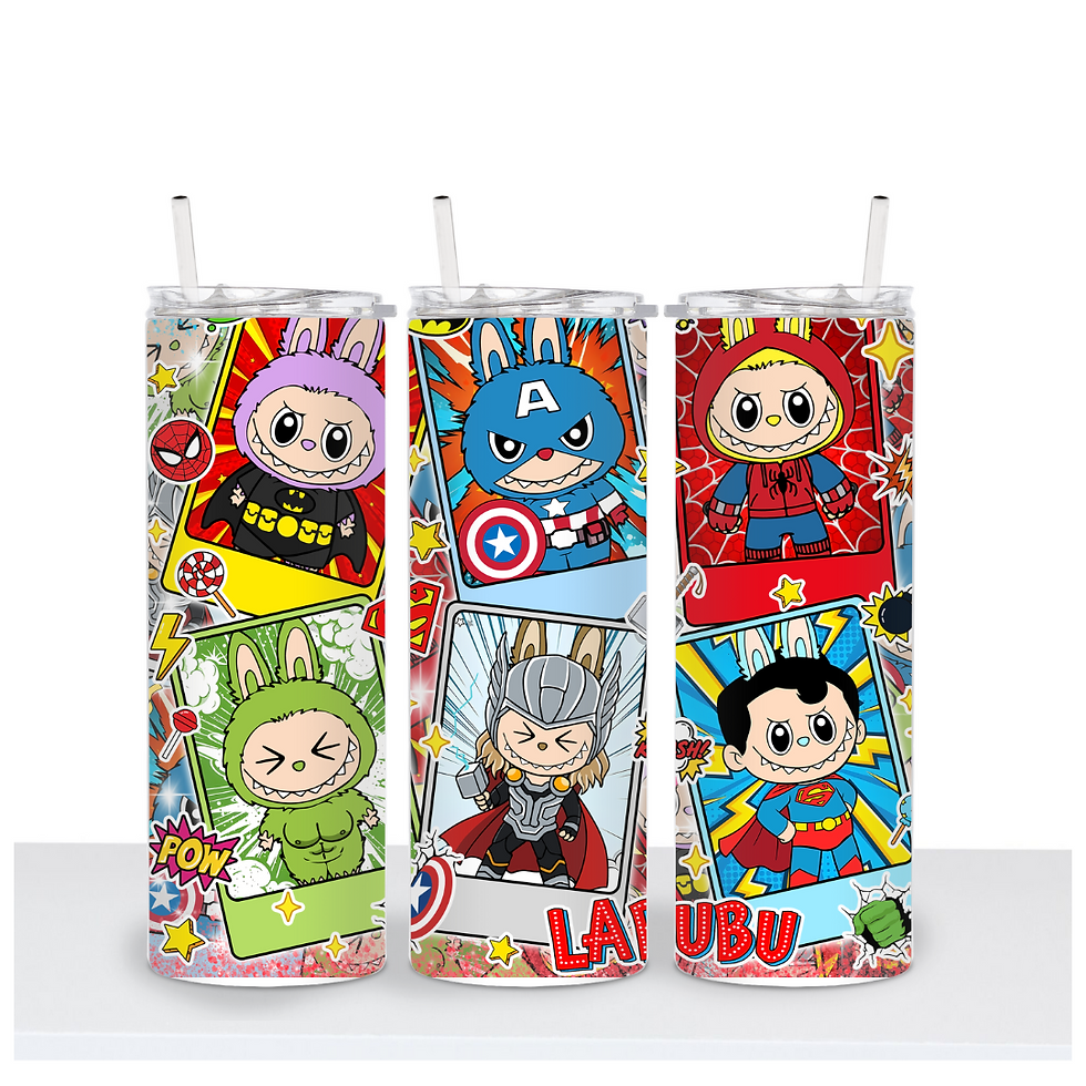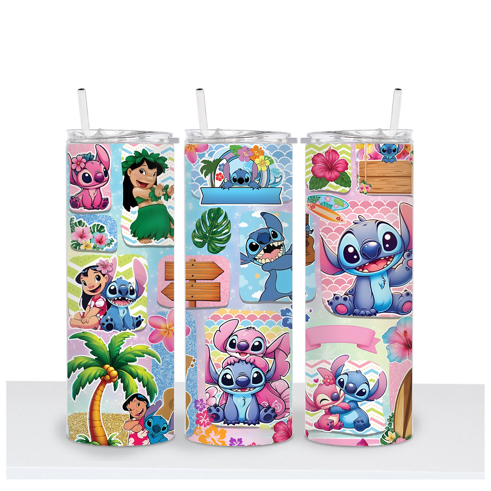 All of the printed metal tumblers are made by sublimation printing, a method that uses heat to transfer ink from transfer paper onto a tumbler. A design is created on a computer and then printed onto the transfer paper with a sublimation printer. The paper is then heated to transfer the ink to the polyester-coated plain tumbler. The ink is heated so that it vaporizes and becomes a gas, which is then transferred onto the surface of the tumbler, leaving a durable and vibrant image.